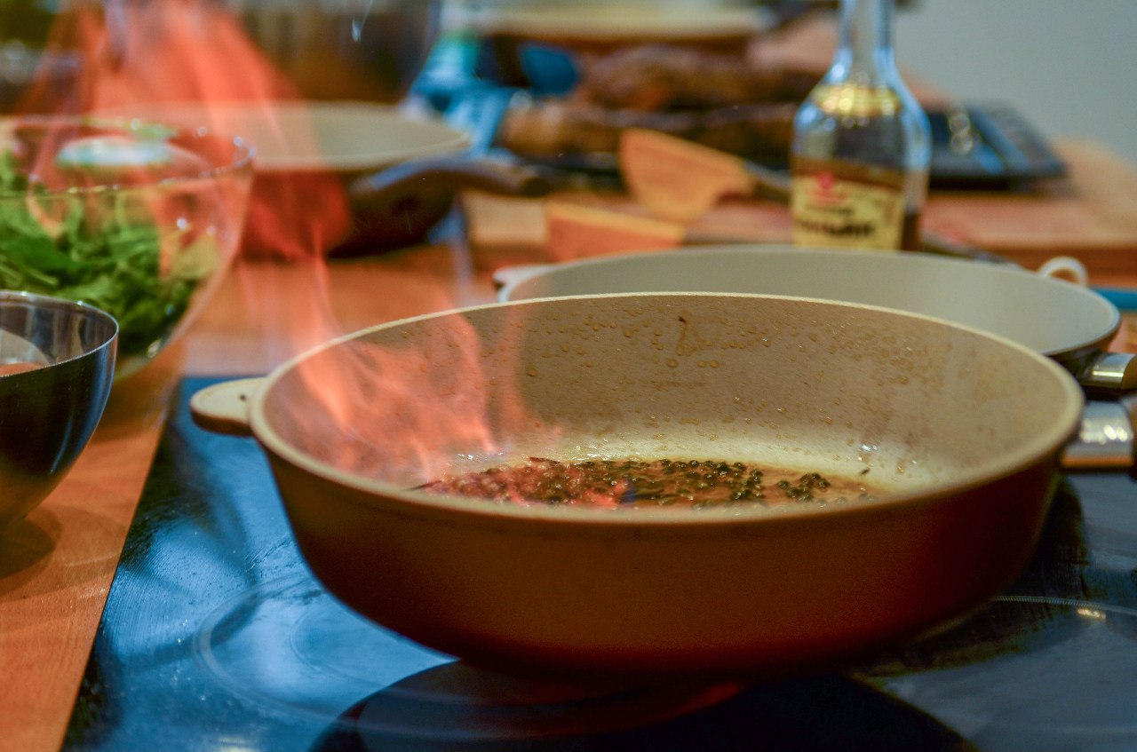 4. Фламбируйте: добавьте коньяк и подожгите. Дождитесь, пока весь спирт выгорит. (В целях безопасности, можно просто дать покипеть коньяку и не поджигать его).