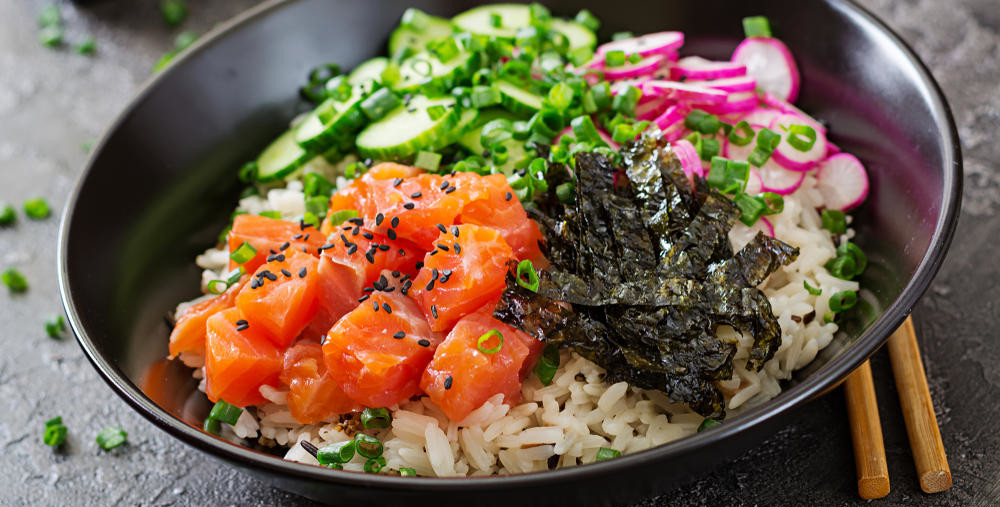 1. Поке с лососем, авокадо, свежим огурцом и азиатским рисом.